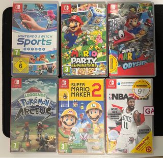 Pack de 6 videojuegos para Nintendo Switch. - Mario Party Superstars - Super Mario Odyssey - Super Mario Maker 2 - Nintendo Switch Sports - Pokémon Leyendas Arceus - NBA 2K18 Se pueden ofertar juegos por separado.