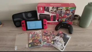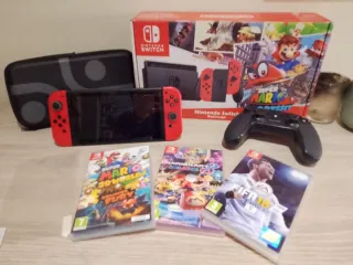 Consola Nintendo Switch en color rojo, lista para jugar. Incluye accesorios y cuatro videojuegos. Esta en perfecto estado, todavía se conservan plásticos y protecxiones. Impoluta - Funda de transporte negra. - Mando Pro Controller negro. - 2 cristales templados ( uno puesto + otro repuesto) - Super Mario 3D World + Bowser's Fury. - Mario Kart 8 Deluxe. - FIFA 18. - Super Mario Odissey descargado