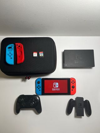 Nintendo Switch con Joy-Con rojo y azul. Incluye 2 juegos (FIFA 21 y Mario + Rabbids Kingdoom Battle), mando Pro para mayor comodidad, dos fundas para cada Joy-Con y funda de transporte resistente con mucho espacio. La consola funciona sin problemas. La pantalla tiene leves arañazos estéticos que no afectan al juego y el Joy-Con derecho tiene el seguro algo flojo, solo se sale si se hace fuerza, pero funciona correctamente al jugar. Un pack muy completo, a un precio más ajustado por los detalles mencionados. Si necesitas fotos, vídeos o info extra, las envío sin problema; Wallapop solo permite 10 fotos.