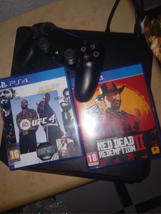 Consola PlayStation 4 Slim de 500GB en color negro. Incluye dos videojuegos: - UFC 4 - Red Dead Redemption 2 - (PRECIO NEGOCIABLE)