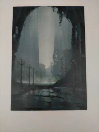 Conjunto de tres postales decorativas del videojuego Elden Ring. - Incluye dos láminas con arte del juego. - Una lámina con arte de personaje y paisaje.