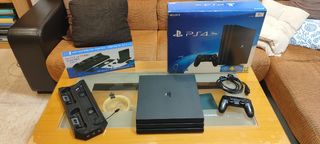 Consola de videojuegos en color negro. - Incluye base refrigerante. - Modelo PS4 Pro. - Mando DualShock 4. - 4 soportes elevadores para mejorar la refrigeración. - 1 lona anti polvo. - Juego Pes 2015 . - Juego Alan Wake. - Juego Wreckfest. - Juego Dying Light The Following.