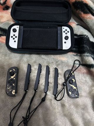 Consola Nintendo Switch con un diseño especial inspirado en Pokémon. Incluye su funda protectora y varios Joy-Cons. - Funda de transporte. - Joy-Con izquierdo con diseño de Pikachu y Rayo. - Joy-Con derecho con diseño de Pikachu y Rayo. - Tres Joy-Cons negros adicionales.
