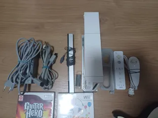 Pack de consola Nintendo Wii con juegos y accesorios. - Incluye consola Wii. - Guitarra de Guitar Hero. - Juego Wii Play. - Mandos y cables.