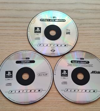 Conjunto de tres videojuegos para PlayStation 1 Platinum. Solo los discos. Con evidentes marcas de uso. Los 3 funcionan. - Rayman - Mickey's Wild Adventure - Bust-a-Move