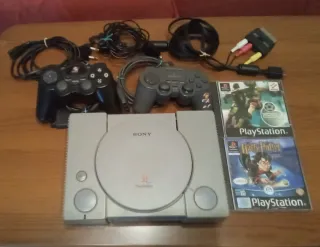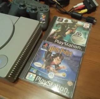 Pack de consola PlayStation 1 con accesorios y juegos. - Consola PlayStation 1. - Dos mandos. - Harry Potter y la Piedra Filosofal (original sin manual) - ISS pro (grabado) - Cables de conexión. La consola funciona perfectamente y lee juegos grabados