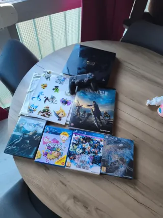 Consola PS4 Slim Luna Edition 1TB: Modelo de máxima capacidad. Firmware 11.02 (versión baja, muy buscada). Funcionamiento impecable y silencioso. Estética con marcas de uso mirar fotos, pero grabado de la luna perfecto. Guía Oficial FFXV Piggyback (ESTADO 10/10): Absolutamente impecable, sin marcas, roces ni esquinas dobladas. Una joya difícil de ver en este estado. FFXV Deluxe Edition: Incluye la exclusiva Steelbook (caja metálica) con diseño de Yoshitaka Amano. World of Final Fantasy Limited Edition: Con sus pegatinas originales. FFVII Advent Children: Edición especial 2 Discos (DVD/BR). Melbits World: Juego adicional de regalo.