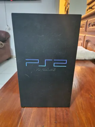 Consola clásica PlayStation 2 en color negro. Del año 2000. En buen estado funcionando. Le falla solo el conector del mando 1, y el mando un pequeño pelón en las imágenes se aprecia. Diseño vertical. Logo de PlayStation 2 en la parte frontal.