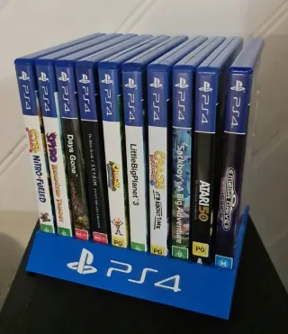 Soporte expositor para juegos de PS4. Muestra tus juegos de forma ordenada y elegante. Para 10 juegos - Diseño robusto, sencillo y elegante - Logo incrustado - Pregunta por más colores - Diaponibles para cualquier consola y caja. Mira los otros artículos, pregunta por lo que no ves y haz tu lote :) Ps2 ps1 saturn gamecube dreamcast nes megadrive n64 mastersystem neogeo ps3 gamegear psp wii switch xbox 360