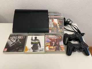 Se vende consola PlayStation 3 en color negro, junto con una colección de nueve videojuegos y dos mandos. Incluye todos los cables necesarios menos HDMI. Incluye los siguientes títulos: - Call of Duty: Black Ops II - Call of Duty: Modern Warfare 3 - Uncharted 3: La traición de Drake - The Last of Us - Fifa street -Fifa 16 -Fifa 14 -Call of duty 3 -NBA2K12
