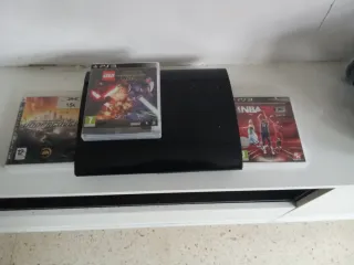 Consola PlayStation 3 Super Slim en color negro. Probado a fecha de 12/01/2026 y funcionando perfecto. Hay fotos de los juegos. - Incluye 1 mando. - Incluye 2 videojuegos: WWE 2K15 y Assassin's Creed IV: Black Flag. - Cables de conexión y carga.