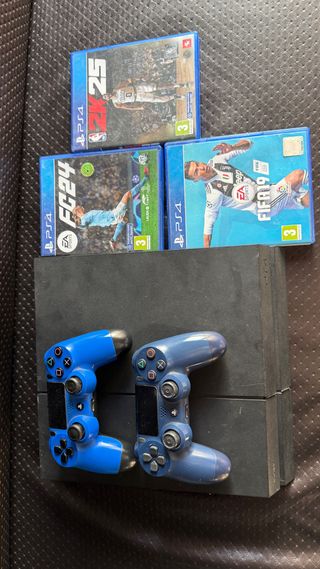 Consola PlayStation 4 Slim en color negro, junto con tres videojuegos+ gta y dos mandos - Juegos incluidos: FIFA 19, FC 24, NBA 2K25. - Dos mandos DualShock 4 en color azul. - dos cables . Lo vendo por falta de uso