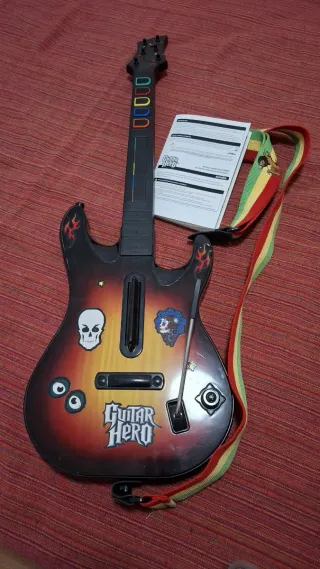 Controlador de guitarra para Guitar Hero. Presenta un diseño llamativo con calaveras y llamas. - Incluye correa para colgar. - Botones de colores en el mástil. - Pegatinas decorativas.