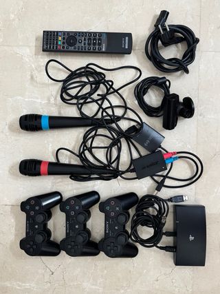 Pack de accesorios PlayStation 2. 3 mandos y 8 juegos. - Incluye 2 mandos PS2 y 2 de Ps1 compatible. - Incluye 2 micrófonos SingStar con su adaptador. - 1 cable de video ps2 - Juegos incluidos: - Football Generation - Pro Evolution Soccer 3 - SingStar Latino - Pro Evolution Soccer 2009 - True Crime New York City - FIFA 10 - MotoGP3 - World Super Police Todos los juegos con sus manuales originales