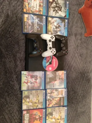 Consola PlayStation 4 Slim con disco duro de 500GB. - Incluye dos mandos DualShock. - Se acompaña de The last of Us Part II, FIFA 18, Assassin Creed Valhalla. - Soporte de Carga Lo vendo porque compré una PS5.