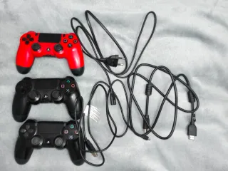 Consola PlayStation 4 con dos mandos negros y uno rojo. - Incluye consola. - Tres mandos de control muy bien estado -incluye todos los cables. -Detalle(última foto) tiene un pequeño golpe en la esquina trasera, no afecta en nada su funcionamiento, la consola no hace ningún ruido.