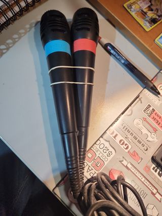 Tres micrófonos para Playstation 2 y 3, en buen estado. - Se incluyen cuatro micrófonos con cables. - Los micrófonos son de color negro con detalles en azul y rojo.