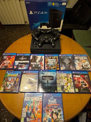 Consola PlayStation 4 Pro de 1TB en color negro, junto con 3 mandos y 14 videojuegos. - Consola PS4 Pro 1TB version 11.00. - Tres mandos DualShock 4. - Juegos incluidos: Crash Bandicoot 3, WWE 2K17, Assassin's Creed The Ezio Collection, Mafia III, FIFA 17, Family Fun Pack, Grand Theft Auto V, NBA 2K17, Heavy Rain, Beyond Two Souls, Just Dance 2017, BioShock Collection, BattleBorn y XCom 2. Los 3 mandos presentan drift en los joysticks. Dependiendo del juego puede notarse o no.