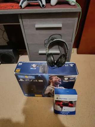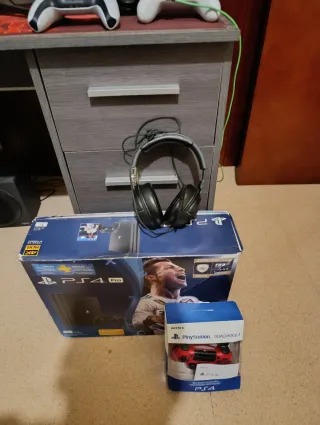 Consola PlayStation 4 Pro de 1TB en color negro. La vendo por falta de uso ya que tengo otras consolas. - Modelo: PlayStation 4 Pro - Capacidad: 1TB - Color: Negro - Mantenimiento hecho en el mes de diciembre (limpiado del interior y cambio de pasta térmica). - Incluyo mando totalmente original y nuevo. -Incluyo 3 juegos ,algunos bastantes usados pero funcionales. ( Gta 5 , FIFA 18 y Good of War). - Cascos razer negros ya usados. - Doy tres mandos más con mucho uso. - Tengo su caja original y cables.