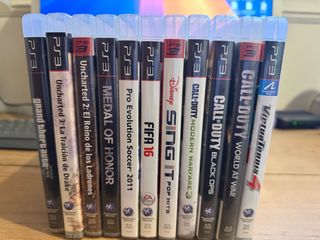Lote de 11 videojuegos para PlayStation 3. Lote por 50€, 8€ individualmente - Grand Theft Auto V - Uncharted 3: La Traición de Drake - Uncharted 2: El Reino de los Ladrones - Medal of Honor - Pro Evolution Soccer 2011 - FIFA 16 - Disney Sing It: Pop Hits - Call of Duty: Modern Warfare 3 - Call of Duty: Black Ops - Call of Duty: World at War - Virtua Tennis 4