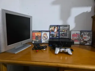 Consola PlayStation 2 modelo FAT en color negro, junto con un monitor plateado. - Incluye mando original. - Juegos: Pro Evolution Soccer 3, Pro Evolution Soccer 2, Smackdown vs Raw 2005, Fast & Furious, Play.com. - Cables de conexión. -tarjeta de memoria -NO INCLUYE EL CABLE DE ALIMENTACIÓN -La disquera está un poco dañada, es recomendable llevarla a reparación no lee bien los títulos y hace mucho ruido -el monitor sale gratis con su cable de alimentación (el cual no es compatible con el de la Ps2)