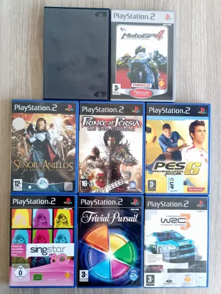 Lote de 8 videojuegos para PlayStation 2, incluyendo dos micrófonos SingStar. - MotoGP 4 - Prince of Persia: Las Dos Coronas - The Lord of the Rings: El retorno del rey - WRC 3 FIA World Rally Championship - Trivial Pursuit (como nuevo) - Pro Evolution Soccer 6 - SingStar 80s (como nuevo, versión alemana) - Need for Speed Underground (en caja sin portada ni librito) - 2 micrófonos SingStar con adaptador para conexión a PS2