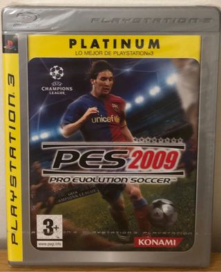 Videojuego de fútbol PS3: PRO EVOLUTION SOCCER 2009; “PES 2009”. Edición “PLATINUM”, para la consola Play Statión. El producto está completamente nuevo. Está cerrado, sellado y precintado de fábrica, con sus sellos y precintos originales de autenticidad del producto. Carátula, manual y juego en castellano, con designación PAL ESPAÑA .