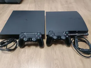 Pack de consolas PlayStation 3 y PlayStation 4 Pro en color negro. Incluye dos mandos. - Consola PlayStation 3. - Consola PlayStation 4 Pro. - Dos mandos PS4. - Ambos cables de alimentación.