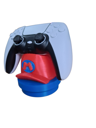 Soporte temático de Mario Bros para mandos de PlayStation 5 y PlayStation 4. Fabricado en impresión 3D con acabado de calidad. - Diseño inspirado en el icónico sombrero de Mario. - Base de color azul. - Soporte principal en color rojo con el emblema de Mario.