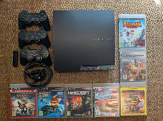 Consola PlayStation 3 Slim en buen estado, junto con una selección de seis videojuegos. - Juegos incluidos: - Rayman Origins - MotorStorm - Ratchet & Clank: Essentials, Q force, All 4 One - Minecraft: PlayStation 3 Edition - Little Big Planet - Incluye 3 mandos, 1 va por usb - Incluye cables de conexión.