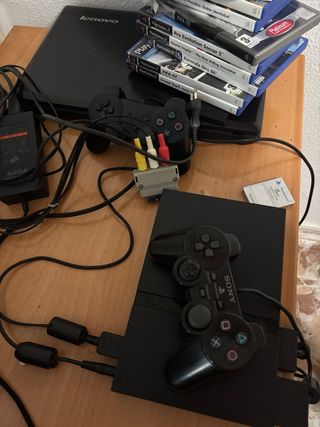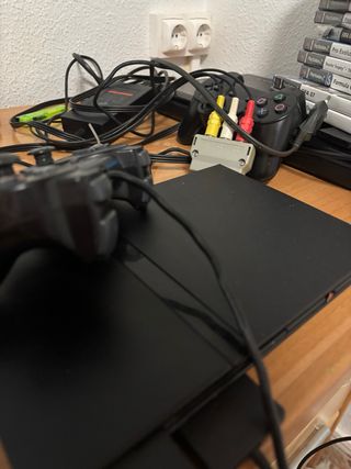 Consola PlayStation 2 Slim en color negro. Incluye dos mandos y cables. Funciona perfectamente, puedo pasar vídeos y fotos sin compromiso Incluye un mando y los cables a la tele y a la corriente Regalo 3 juegos incompletos