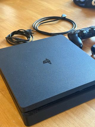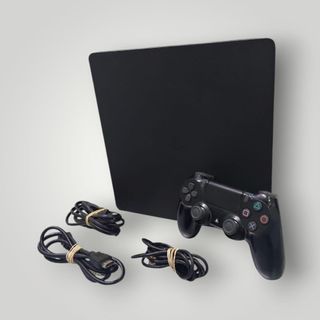 Consola Playstation 4 Slim en color negro, lista para jugar. Incluye mando y todos los cables necesarios para su funcionamiento. - Mando incluido (No de Sony). - Todos los cables necesarios (HDMI, 3 cargadores de mandos, cable de la consola y cable LAN)
