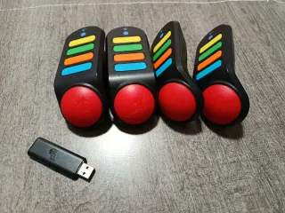 Set de cuatro pulsadores inalámbricos para PlayStation 2 y 3. - Incluye un receptor USB. - Diseño ergonómico con botón rojo superior. - Cuatro botones de colores: azul, naranja, verde y amarillo. En perfecto estado