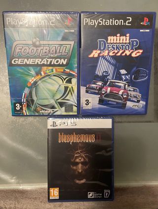 Lote de tres videojuegos para PlayStation 2 y 5. Nuevos precintados. - Football Generation - Blasphemous - Mini Desktop Racing Envío rápido