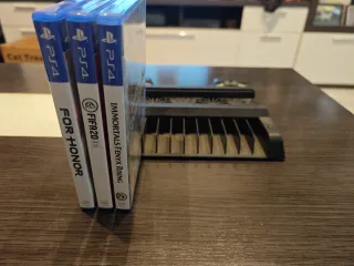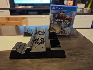 Pack de 3 juegos + base vertical para PS4 con ventiladores + almacenamiento de juegos y puertos USB. - Base de carga vertical para PS4. - Incluye dos ventiladores integrados. - Juegos: Immortals Fenyx Rising + Fifa 20 + For Honor PS4.