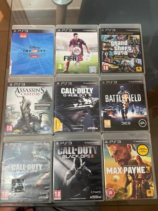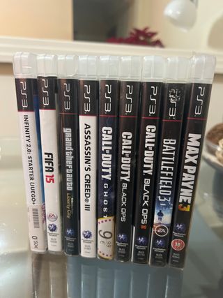 Lote de 8 videojuegos para PlayStation 3. - Infinity 2.0: Starter (Juego+) - FIFA 15 - Grand Theft Auto: Liberty City - Assassin's Creed III - Call of Duty: Ghosts - Call of Duty: Black Ops - Call of Duty: Black Ops II - Battlefield 3 - Max Payne 3 precintado con pequeña rotura en plastico