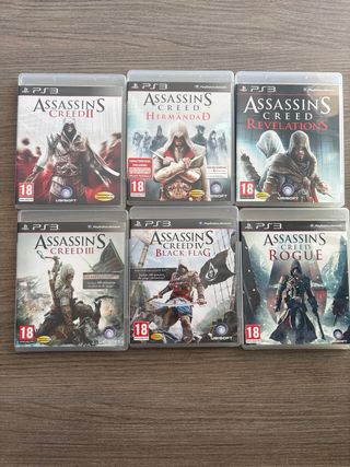 Se vende lote de seis videojuegos de la saga Assassin's Creed para PlayStation 3. - Assassin's Creed II - Assassin's Creed: La Hermandad - Assassin's Creed: Revelations - Assassin's Creed III - Assassin's Creed IV: Black Flag - Assassin's Creed: Rogue
