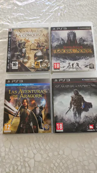 Colección de cuatro videojuegos de la saga El Señor de los Anillos para PlayStation 3. - El Señor de los Anillos: La Conquista - El Señor de los Anillos: La Guerra del Norte - El Señor de los Anillos: Las Aventuras de Aragorn - El Señor de los Anillos: Sombras de Mordor Todos pal esp con manuales y perfecto estado.