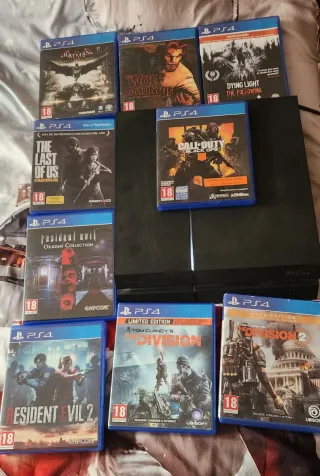 Vendo mi PS4 con dos mandos y juegos. Casi nueva, en perfecto estado. - Consola PlayStation 4 - 2 mandos DualShock 4 - Juegos incluidos: - Goldeneye 007 (PS2) - Crash Bash (PS2) - SSX On Tour (PS2) - Les Chevaliers de Baphomet (PS2) - Crash (PS2) - Call of Duty: Black Ops III (PS4) - Call of Duty: WWII (PS4) - Grand Theft Auto: San Andreas (PS2) - Extreme Sprint (PS2) - Red Dead Redemption (PS4) - Grand Theft Auto V (PS4) - Assassin's Creed Unity (PS4) - Uncharted: The Nathan Drake Collection (PS4)
