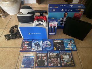 Consola PlayStation 4 con disco duro de 1TB, 2 mandos, gafas de Realidad Virtual PlayStation VR, cámara, mandos Move y ocho videojuegos. - Consola PlayStation 4 Slim 1TB. - Dos mandos. - Gafas PlayStation VR. - Cámara PlayStation. - Dos mandos PlayStation Move. - Juegos incluidos: SUPERHOT VR, Call of Duty Black Ops, Call of Duty WWII, Grand Theft Auto V, FIFA 19, Just Cause 4, Ace combat VR, Ark park VR y también Demo Disc PlayStation VR. Preferible entrega en mano.