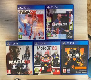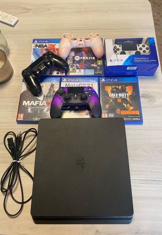 Consola PlayStation 4 Slim en color negro. Incluye: - Mando dualshock blanco - Mando dualshock negro - Mando T-Rex con luces - Funda protectora para mando - Juego NBA2K22 - Juego FIFA 21 -Juego CALL OF DUTY BLACK OPS 4 - Juego MOTOGP 21 - Juego MAFIA III - Cable de alimentación #playstation #ps4 #callofduty #motogp #fifa #mafiaiii #nba #nintendoswitch #dualshock