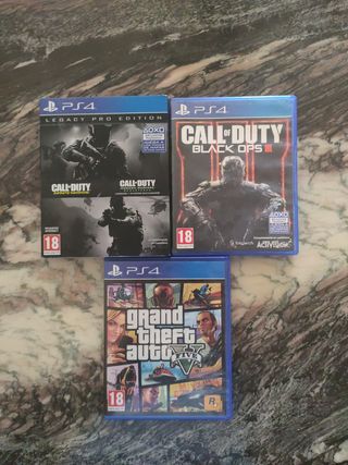 Vendo tres juegos, en buen estado, de la playstation 4 por 40€ el pack. El precio por separado es: Call Of Duty Black Ops 3: 15€ Call Of Duty Infinite Warfare Legacy Pro Edition (Steel Box): 25€ Grand Theft Auto V: 10€