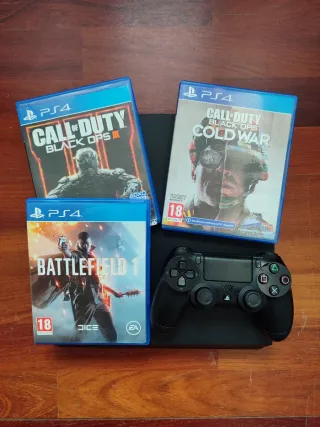 Consola PlayStation 4 en color negro, con un mando y tres videojuegos. Incluye su caja original. NO envío por Correos - Juegos incluidos: Call of Duty Black Ops III, Call of Duty Black Ops Cold War, Battlefield 1. - Mando DualShock 4.