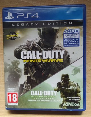 Edición Legacy de Call of Duty Infinite Warfare para PS4. - Incluye Call of Duty: Infinite Warfare y Call of Duty: Modern Warfare Remastered. - Contenido adicional: Mapa Terminal. - Exclusiva PlayStation: Juega a los packs de mapas 30 días antes. - Requisito de internet. - Clasificación PEGI 18. - Completamente en castellano.