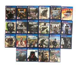 Lote de videojuegos para PlayStation 4. - Call of Duty: Black Ops, WWII, Advanced Warfare, Ghosts, Modern Warfare, Infinite Warfare - Far Cry: Primal, 5, 6, Classic Edition - Grand Theft Auto V - Mafia: Definitive Edition - Assassin's Creed: Syndicate - Uncharted 4 - Watch Dogs, Watch Dogs 2 - The Last of Us - God of War - World War Z - Mad Max