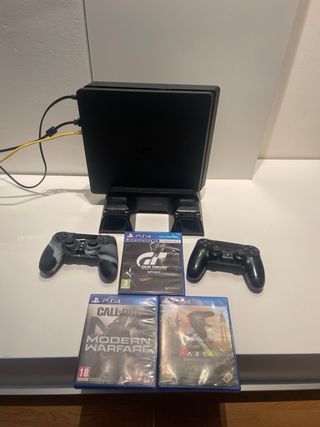 Consola PlayStation 4 Slim en color negro, en excelente estado. Casi sin uso. 500gb. - Incluye 4 videojuegos: FIFA 22, FC 25, Tennis World Tour 2 y Call of Duty Modern Warfare. - Viene con 2 mandos DualShock 4. - Incluye cables de conexión.