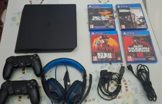 Consola PlayStation 4 Slim en color negro, ideal para disfrutar de tus juegos favoritos. - Incluye dos mandos DualShock 4. - Cuatro videojuegos: Call of Duty Black Ops, Rainbow Six Siege, Red Dead Redemption 2 y Call of Duty Modern Warfare. - Incluye auriculares con micrófono. - Cables de conexión y cargador. NO HAGO ENVIOS SOLO ENTREGA EN MANO. NO CONTESTO A OFERTAS POR DEBAJO DE SU PRECIO MARCADO. CONSOLA Y ACCESORIOS COMO NUEVO.