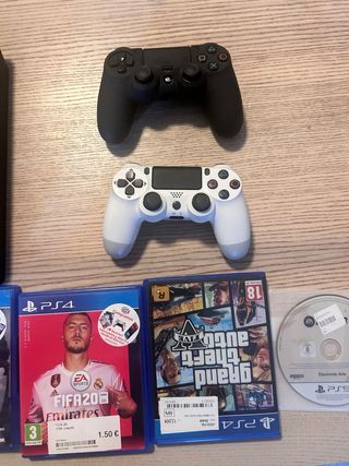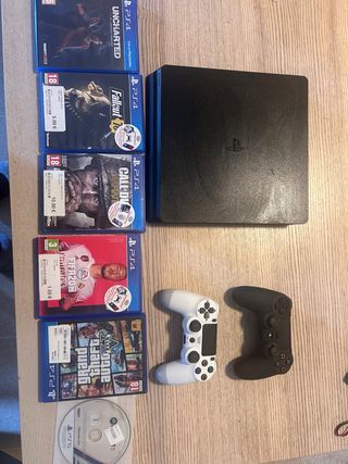 Consola en perfecto estado con todos sus accesorios. - Incluye 2 mandos (uno blanco y otro negro). - Seis juegos: Uncharted, Fallout 4, Call of Duty WWII, FIFA 20, Grand Theft Auto V y un juego adicional. - Incluye todos los cables necesarios.