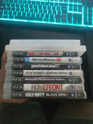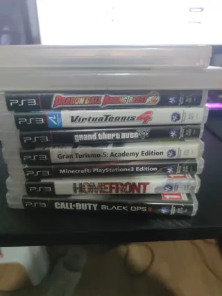 Conjunto de nueve videojuegos para PlayStation 3. - Dragon Ball Z: Battle of Z - Virtua Tennis 4 - Grand Theft Auto V - Gran Turismo 5: Academy Edition - Minecraft: PlayStation 3 Edition - Homefront - Call of Duty: Black Ops II - Call of Duty: MW3 - Minecraft: Story Mode