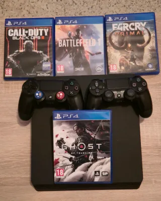 Consola Playstation 4 Slim de 1TB en color negro, prácticamente nueva. Incluye dos mandos originales y cuatro videojuegos. Tambien cables de conexión. - Juegos incluidos: Call of Duty Black Ops III, Battlefield 1, Far Cry Primal y Ghost of Tsushima. - Dos mandos DualShock 4 originales. - Capacidad de almacenamiento de 1TB.
